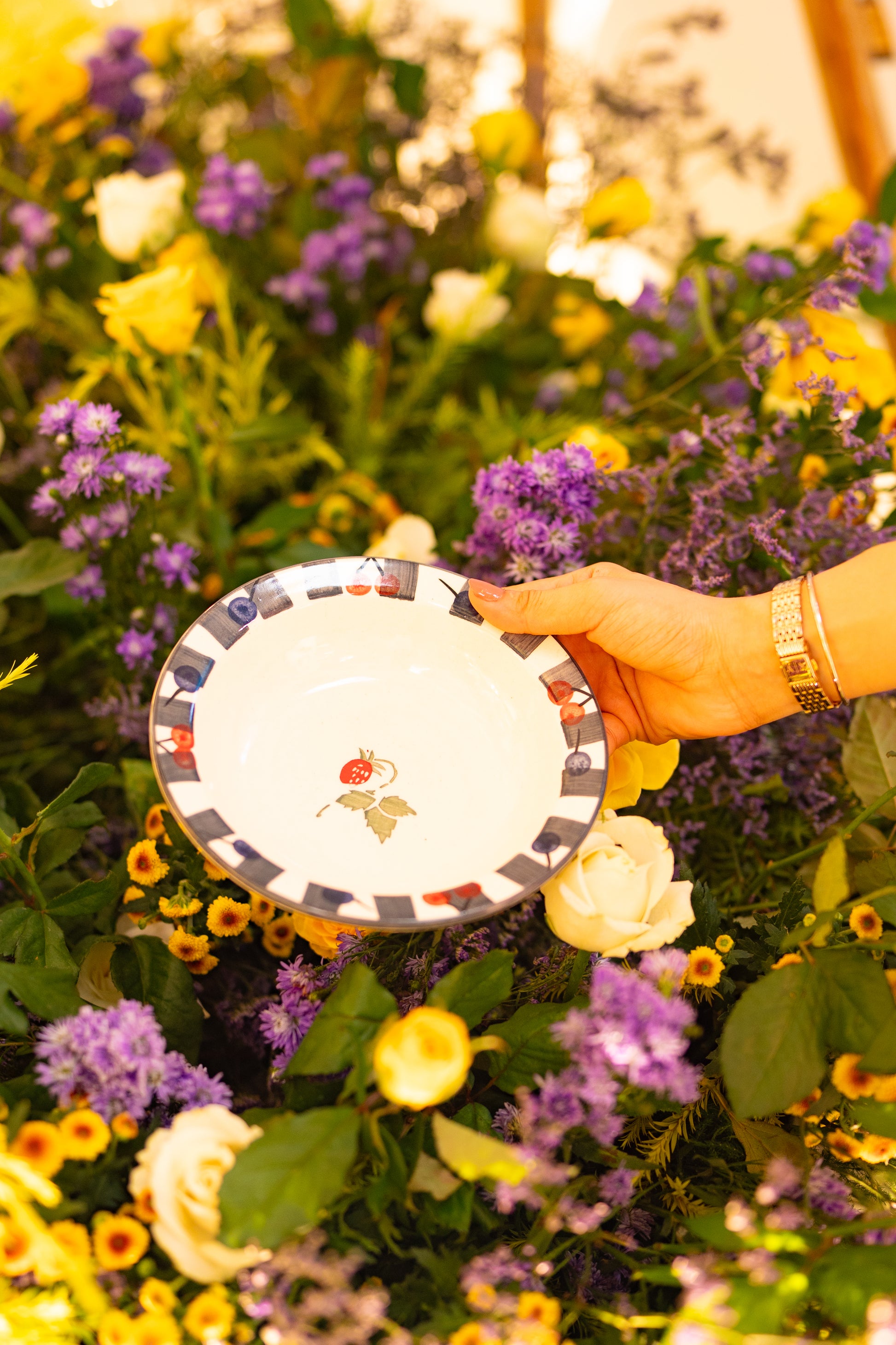 A playful twist on classic ceramics, this handcrafted plate features deep navy stripes around the rim with hand-painted berries and a sweet strawberry illustration at the center. Perfect for pasta, ravioli, salads, desserts, or shared small plates, this charming piece adds a fruity flourish to your table.